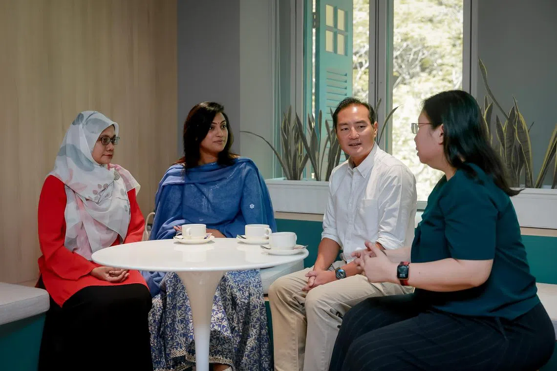 Mr Tan Kiat How (third from left) speaking with NTC members (from left) Nur-El-Hudaa Jaffar, Maria Bhavani Dass and Teo Kah Hui on March 27.