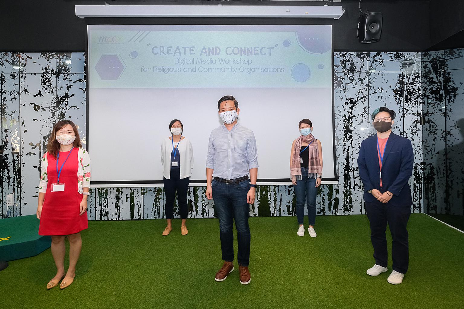 Minister of State for Culture, Community and Youth Alvin Tan (centre) together with (from left) TikTok's Ms Teresa Tan, Google's Ms Rachel Teo, Facebook's Ms Clara Koh and Twitter's Ms Amanda Ang at the launch of the initiative on June 25, 2021.