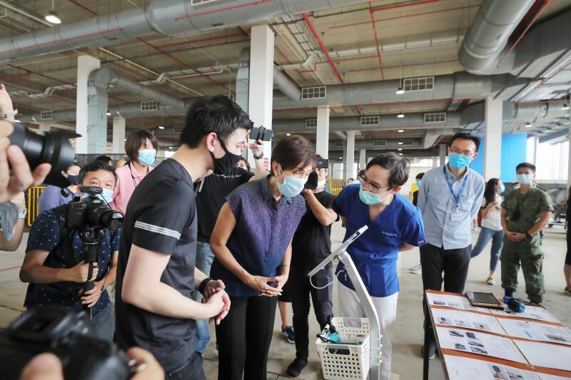 MHC Asia Group medical director Raymond Ong (centre right) explaining the tele-kiosk to Minister for Manpower Josephine Teo at the JTC Space @ Tuas on May 10, 2020.