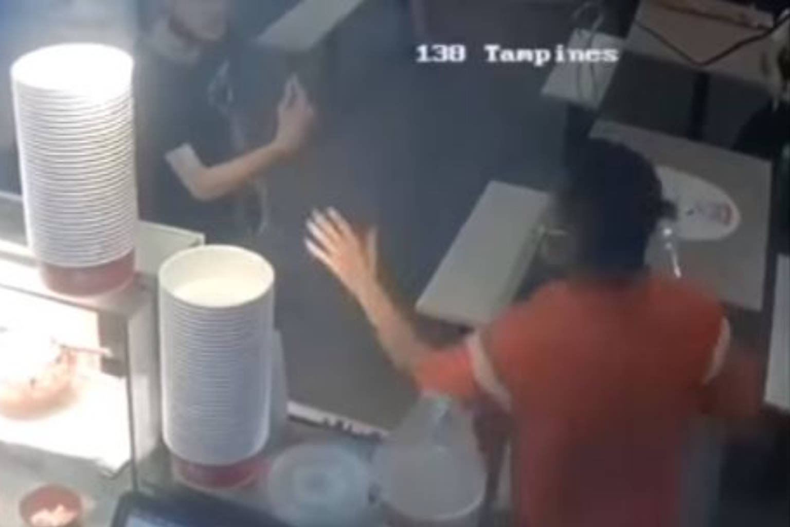 In the video, the hawker is seen talking to the teenager across the stall counter, but the conversation becomes progressively heated.