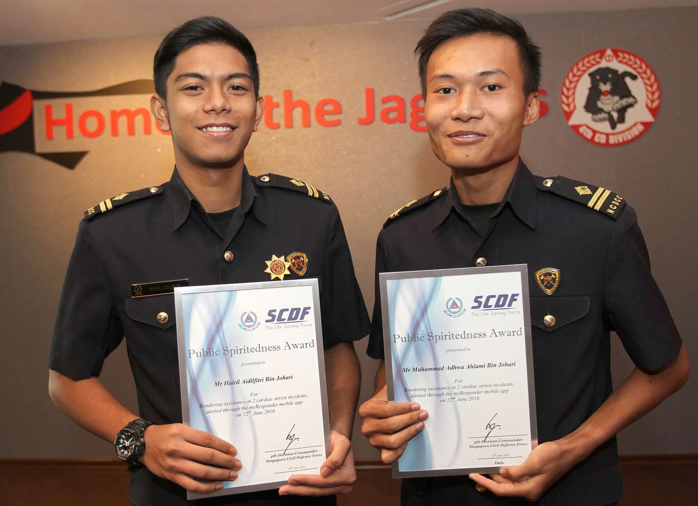 Mr Hairil Aidilfitri Johari, 19, and Mr Muhammad Adhwa Ahlami Johari, 19, went to the aid of two victims in two hours, after Mr Adhwa received two alerts from the myResponder app on Wednesday.