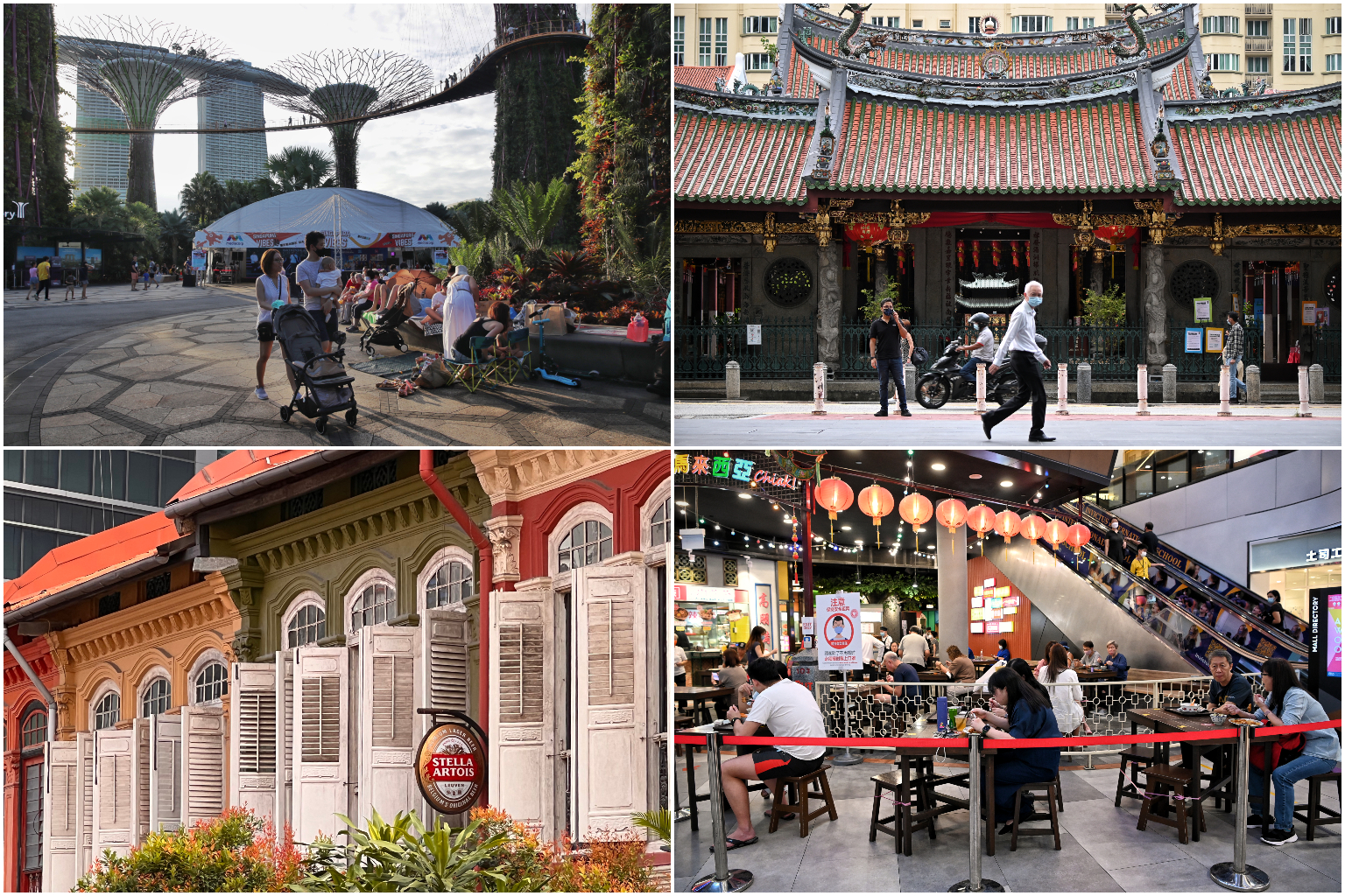 (Clockwise from top left) Gardens by the Bay, Thian Hock Keng Temple, Great World City, Emerald Hill.