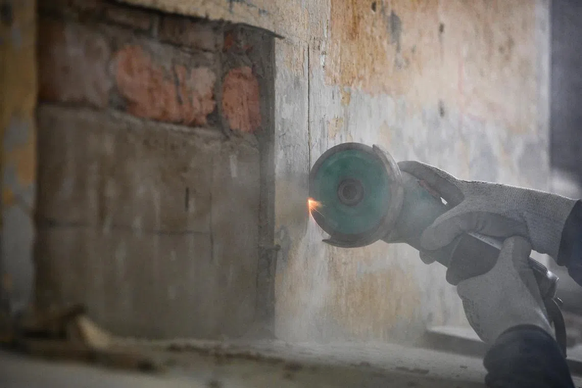 A contractor removing a layer of Telok Ayer Chinese Methodist Church’s wall using a power cutting tool on Feb 7.