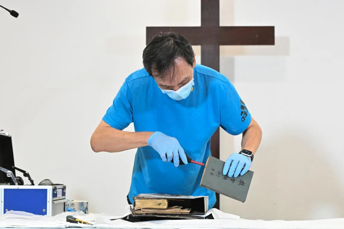 In front of about 100 church leaders and members on-site, and about 150 online, Mr Wong unpacked the box on Feb 14, prising its lid open with a screwdriver before carefully removing each item in it.