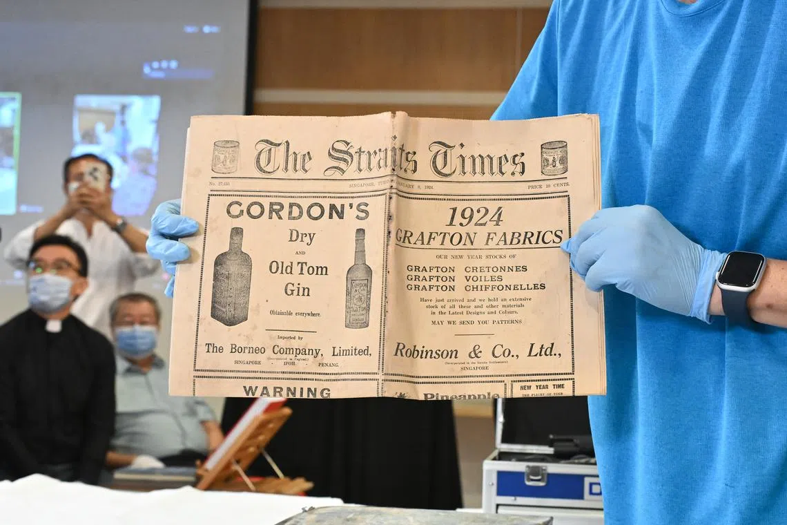 A copy of The Straits Times, published on Jan 8, 1924, was among the artefacts in the century-old time capsule.