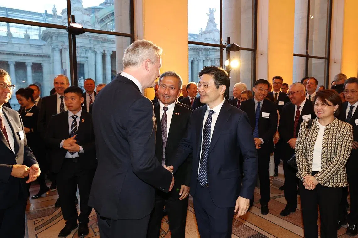 France’s Minister of the Economy, Finance, Industrial and Digital Sovereignty Bruno Le Maire greeting DPM Wong at a reception at Le Petit Palais on April 10 to mark the opening of Temasek’s new Paris office. With them is Foreign Minister Vivian Balakrishnan.