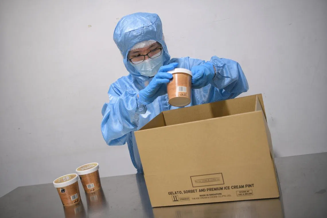 Mr Nicholas Tay, 26, packing pints of ice cream into boxes at The Ice Cream & Cookie Co on May 4, 2023.