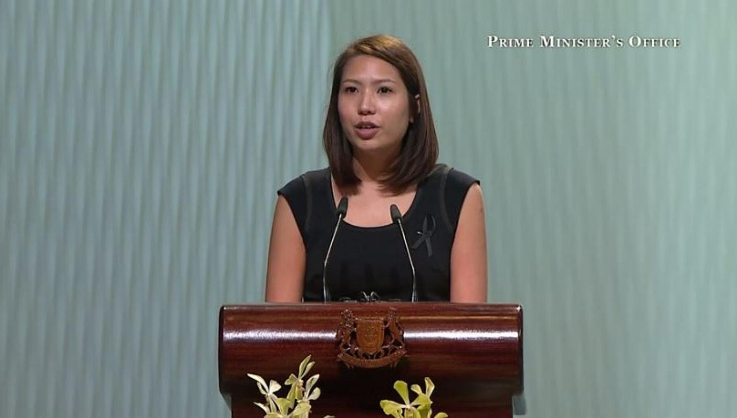 The youngest speaker at the State Funeral service, she was a political journalist with The Straits Times from 2009 to 2011. She left to join the Prime Minister's Office last year.