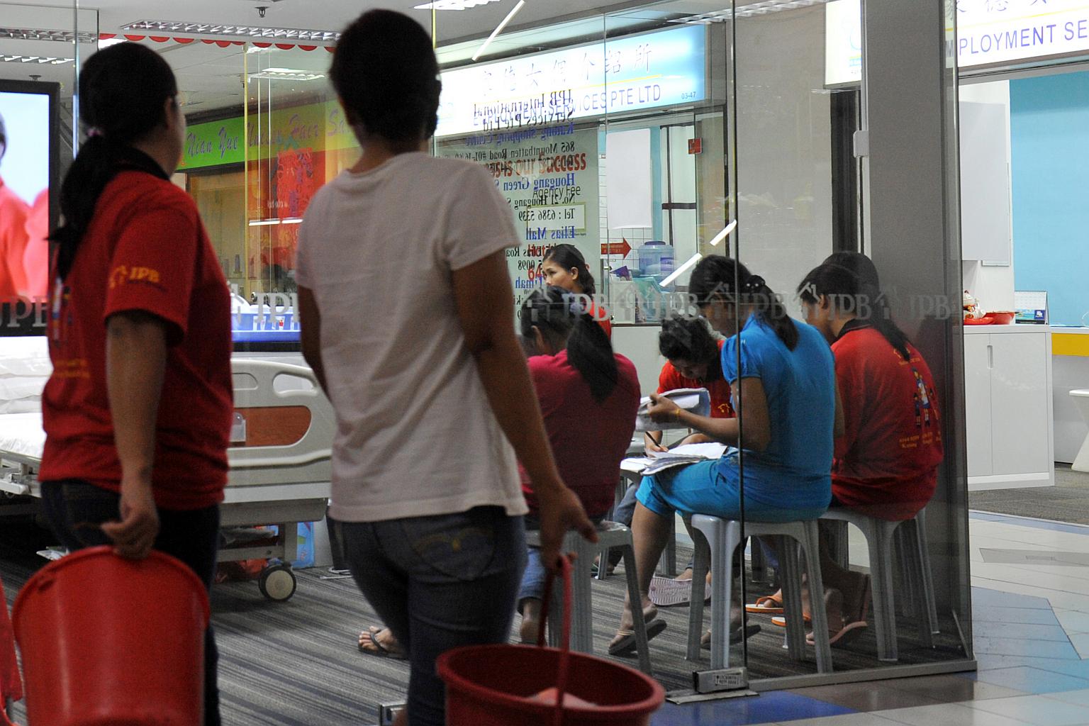 Maids who are undergoing training, seen seated inside a maid agency at Bukit Timah Shopping Centre on Sept 10, 2014.