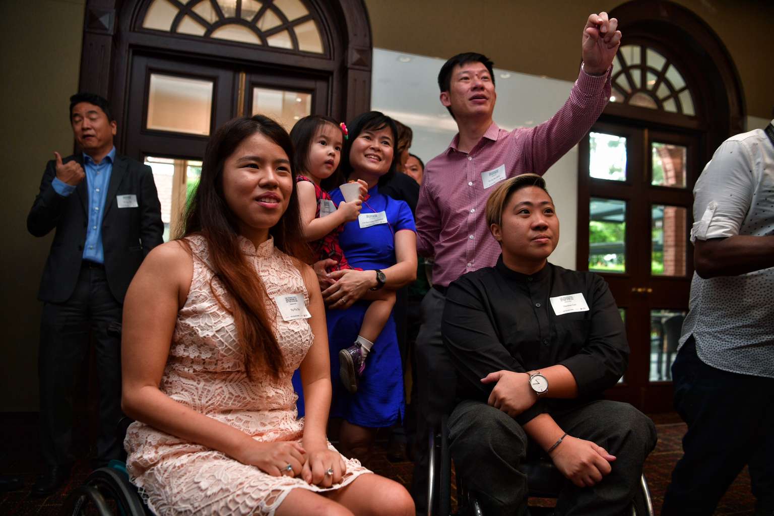 Paralympians Yip Pin Xiu and Theresa Goh take pictures with Dr Chi Wei Ming and his family.