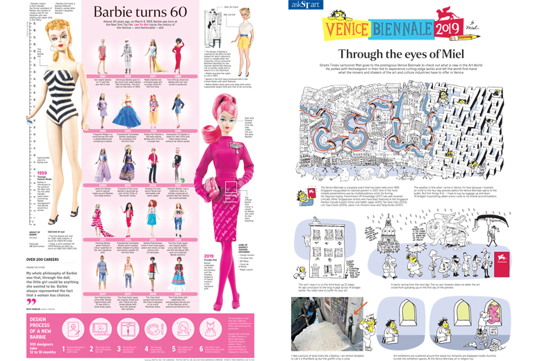 Ms Lee Yu Hui's infographics dedicated to Barbie and senior executive artist Miel Prudencio's creation on his adventures at the Venice Biennale 2019 are among the winners at the Society for News Design's annual competition.