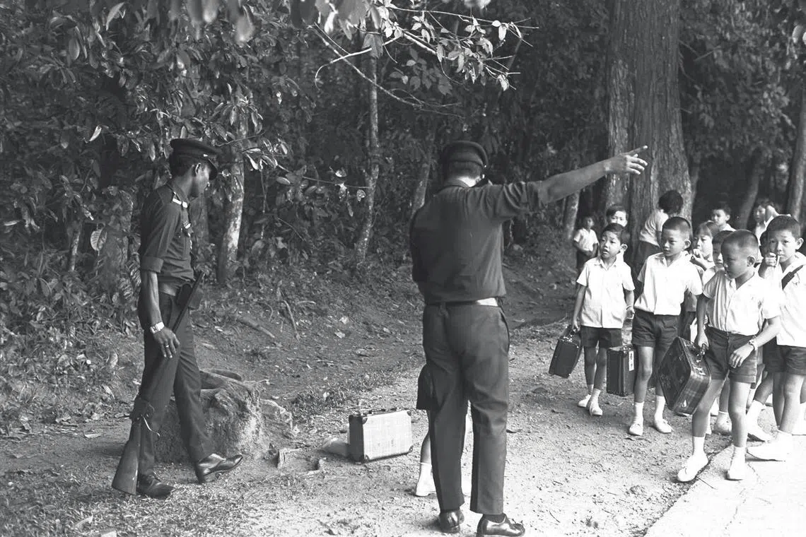 A policeman advising pupils from Sembawang Hills Estate School to stay away from the jungle, as a panther that escaped from the Singapore Zoo had been spotted nearby. Two troops of Reserve Unit officers on duty and three police dogs were ordered to the scene in March 1973.