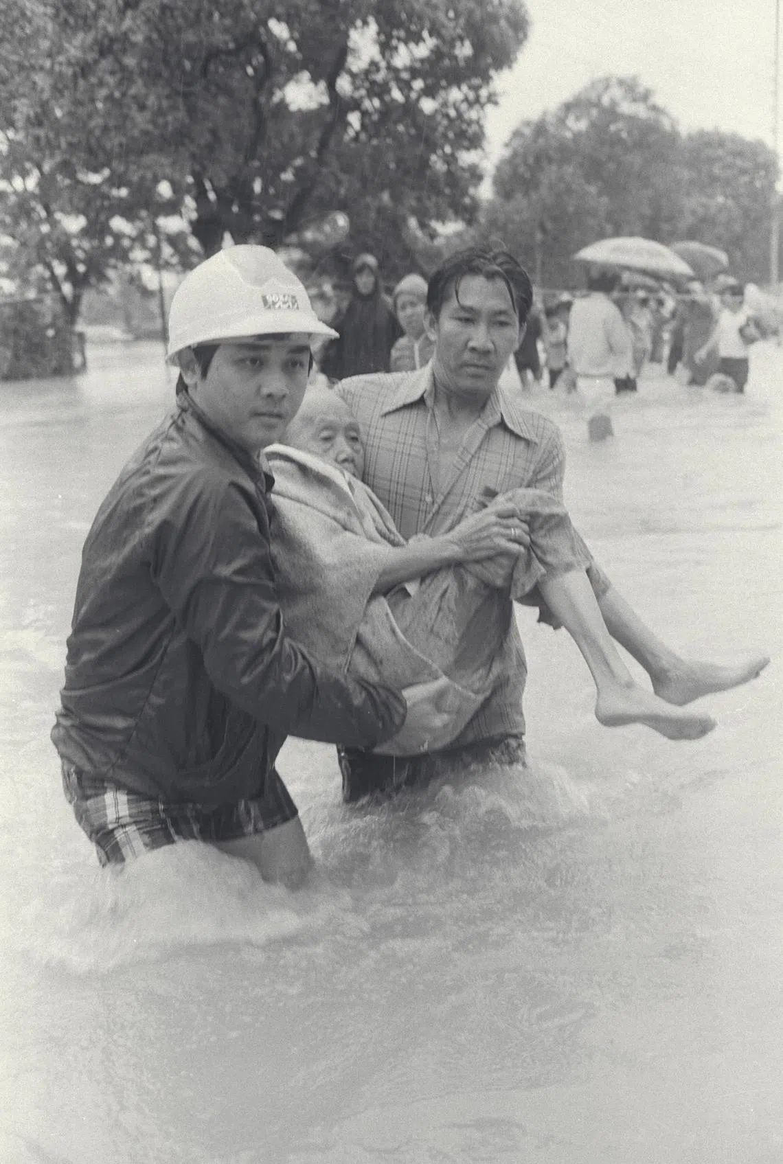 Rescue workers carrying an aged flood victim to dry ground on Dec 3, 1978.