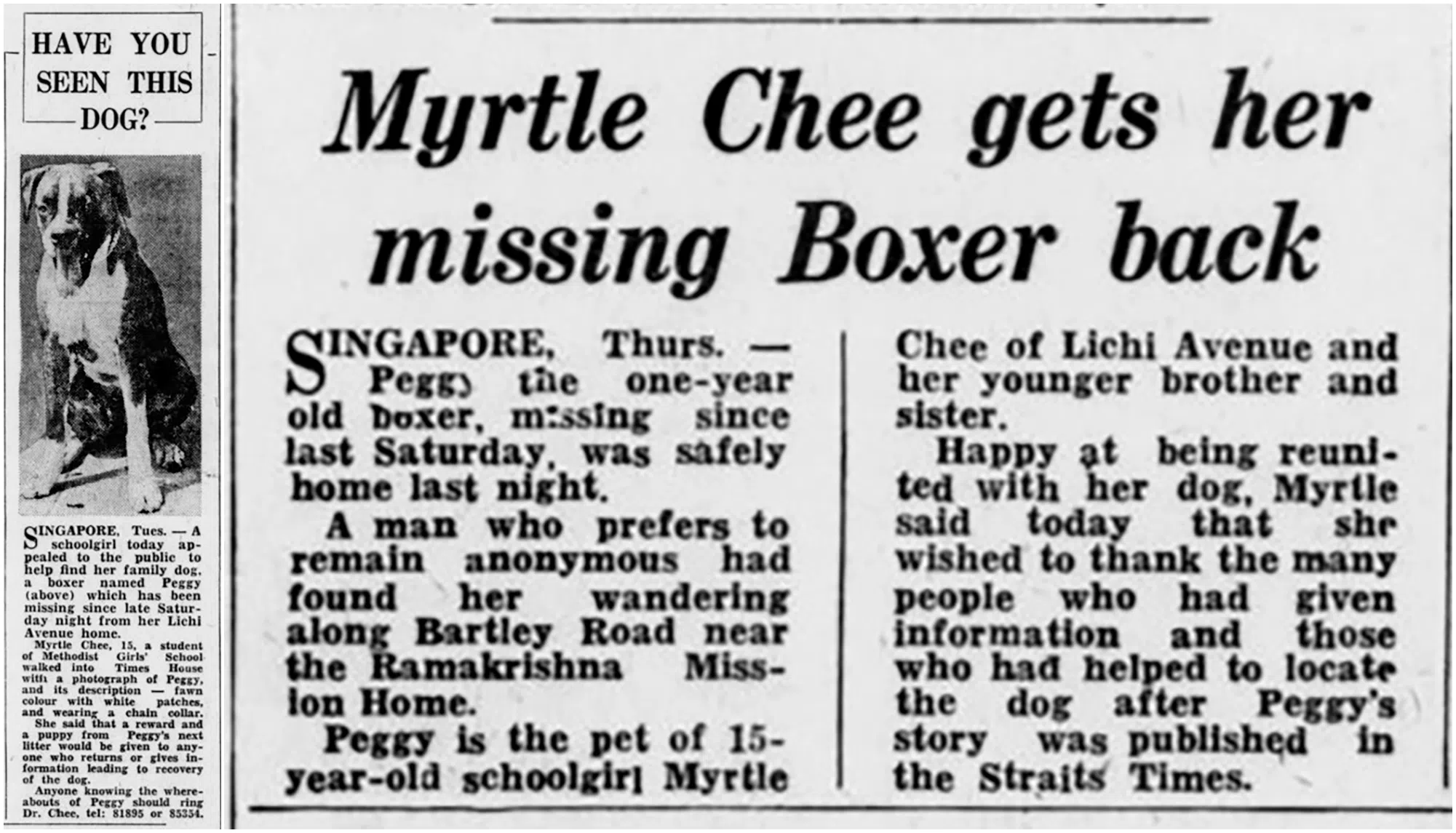 Myrtle, 15, a Methodist Girls’ School student, wanted to offer a reward to anyone who found Peggy or could give information leading to her discovery, the paper reported in a short article on Page 4, nestling it between cinema advertisements and a lead story on Mr Devan Nair agreeing to stay on as NTUC chief.