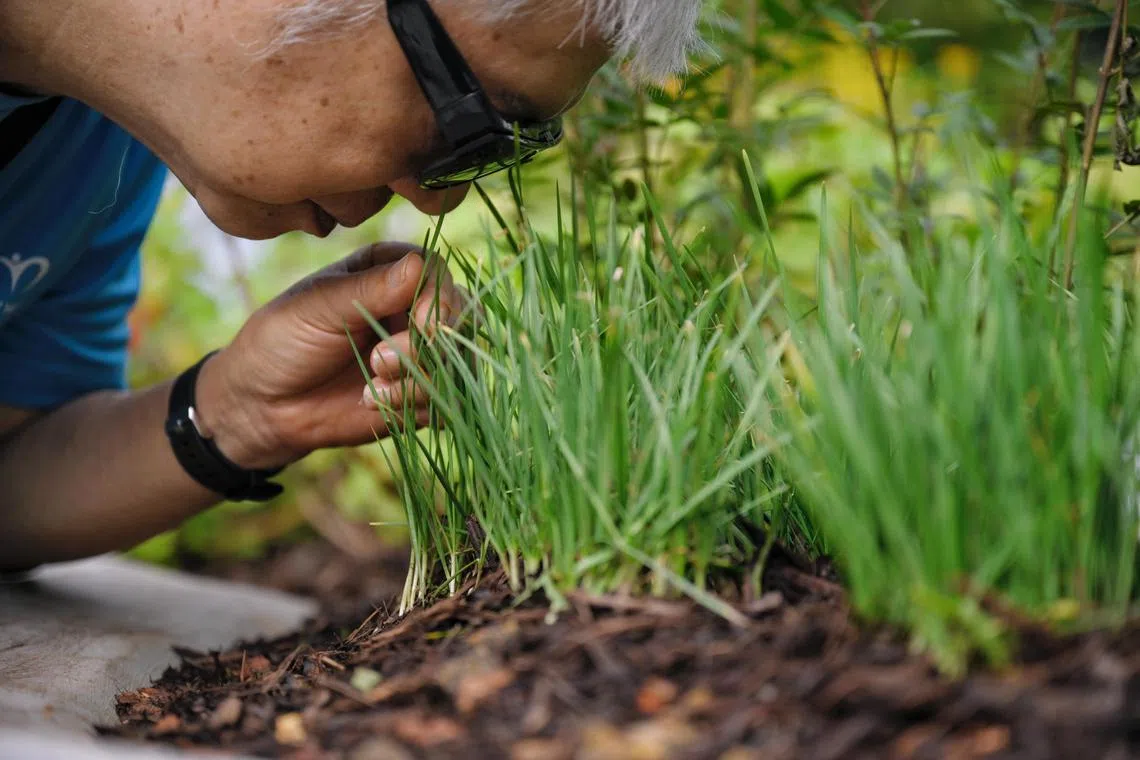 A senior citizen smelling a wild garlic plant at the therapeutic garden at West Coast Park on Sept 12.