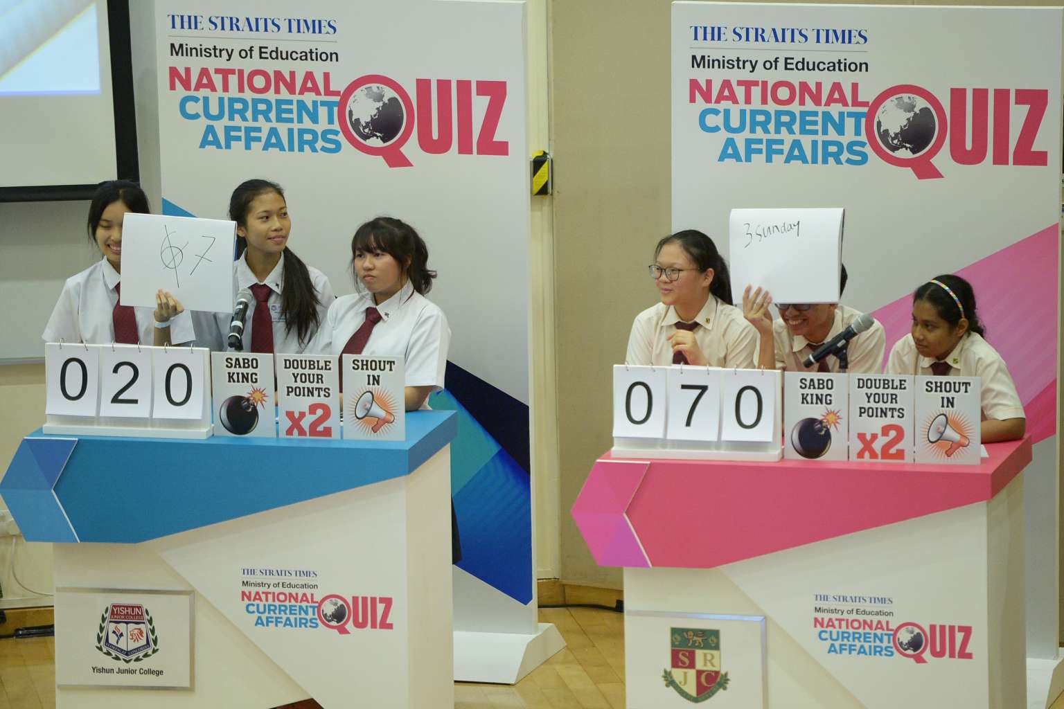 The trio from Yishun Junior College (left) competing against the Serangoon Junior College team in the first round of the annual The Straits Times-Ministry of Education National Current Affairs Quiz on April 6, 2016.