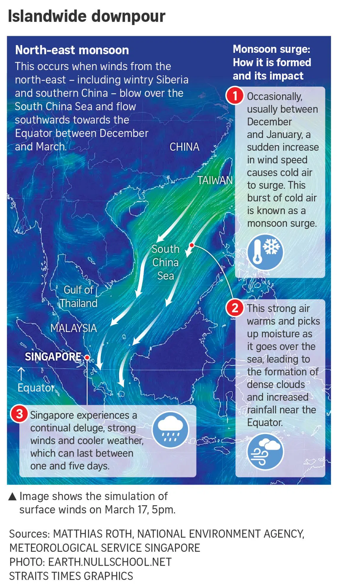 A monsoon surge refers to bursts of cold air from the north-east, such as Central Asia, which flow over the South China Sea before bringing widespread rainfall, strong winds and cooler weather to Singapore. The Republic experiences two to four monsoon surges each year, on average.