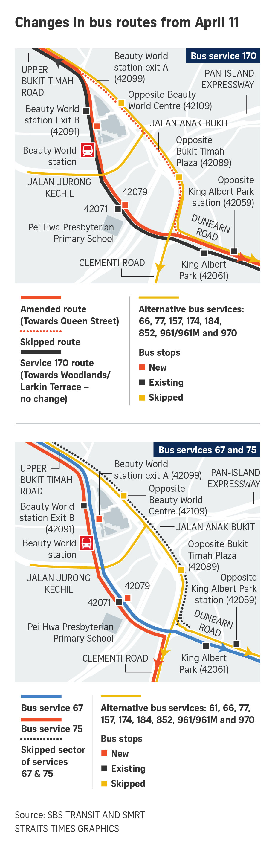 Both SMRT and SBS Transit issued statements on Monday (March 29) informing commuters of the changes. They affect SMRT's services 67 and 75 towards Dunearn Road/Clementi Road, and SBS Transit's service 170 towards Dunearn Road/Clementi Road.