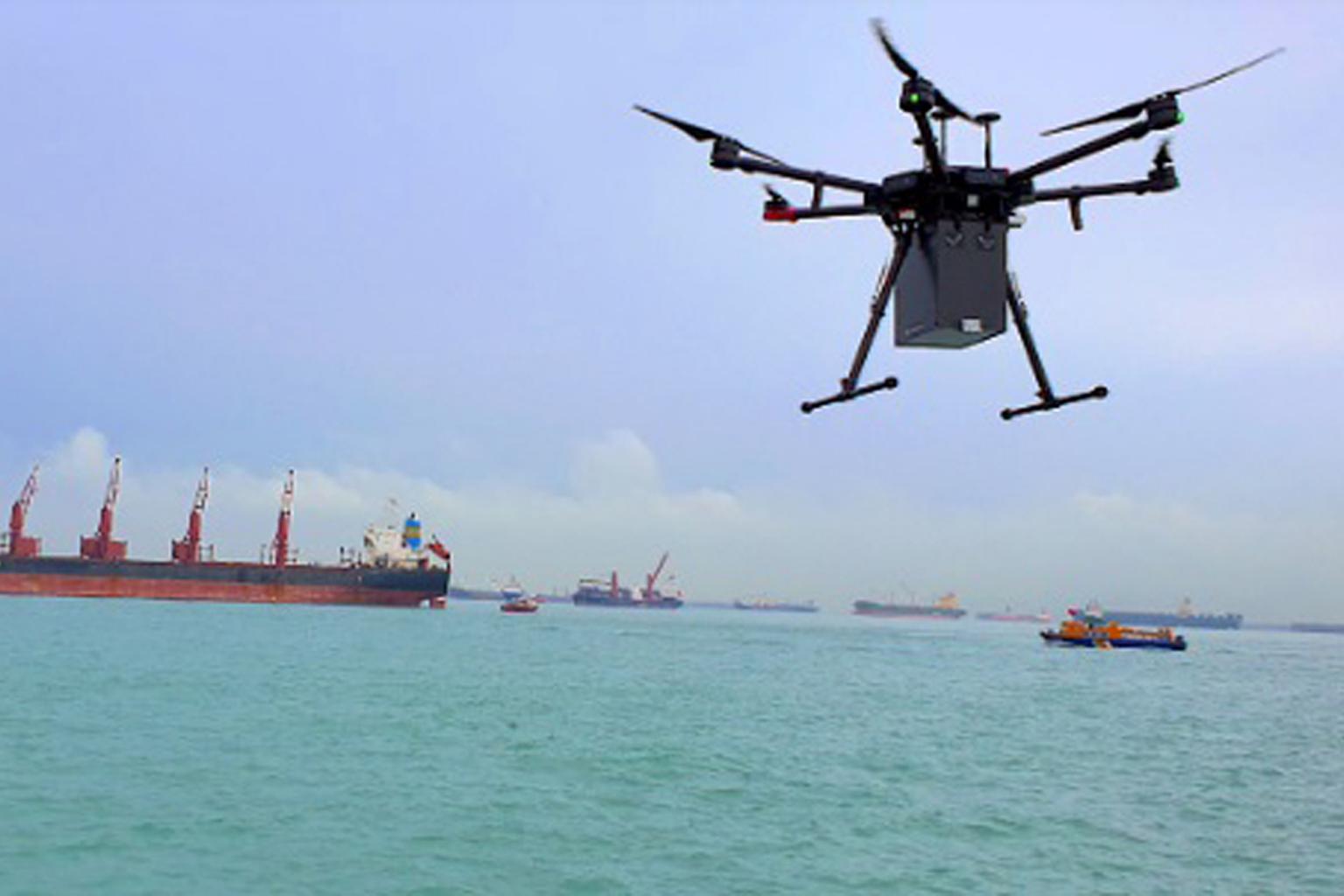 SINGAPORE - At least three companies are now being paid to use their unmanned drones to deliver small items like cash, 3D-printed shipping parts and fuel samples from Marina South to ships out at sea.