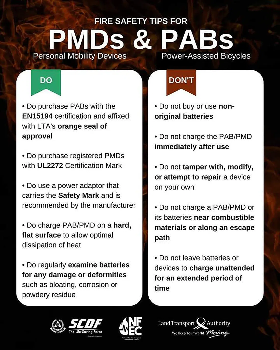 “To prevent PMD and PAB fires, the SCDF would like to remind the public not to charge the batteries for an extended period of time or leave them charging overnight.