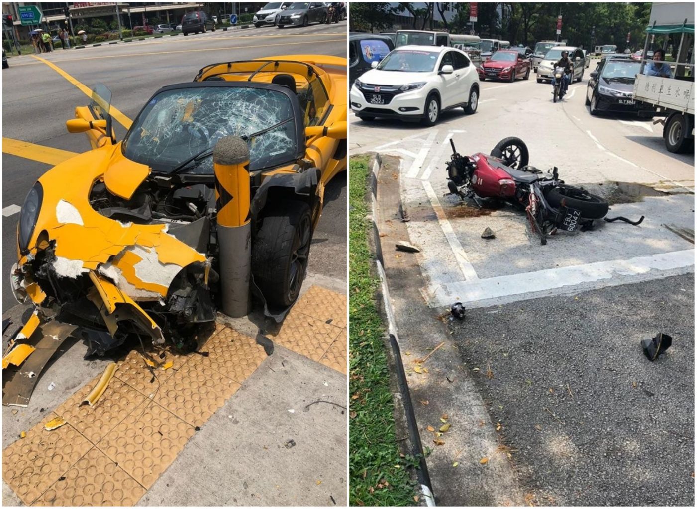 Photos posted on Facebook after the accident at Kaki Bukit on Thursday (Sept 6) showed a heavily damaged yellow sports car and a red motorcycle lying on its side with engine oil or fuel pooled around it.