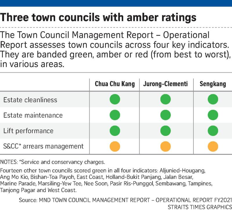 Chua Chu Kang Town Council, Jurong-Clementi Town Council and Sengkang Town Council were given amber ratings.
