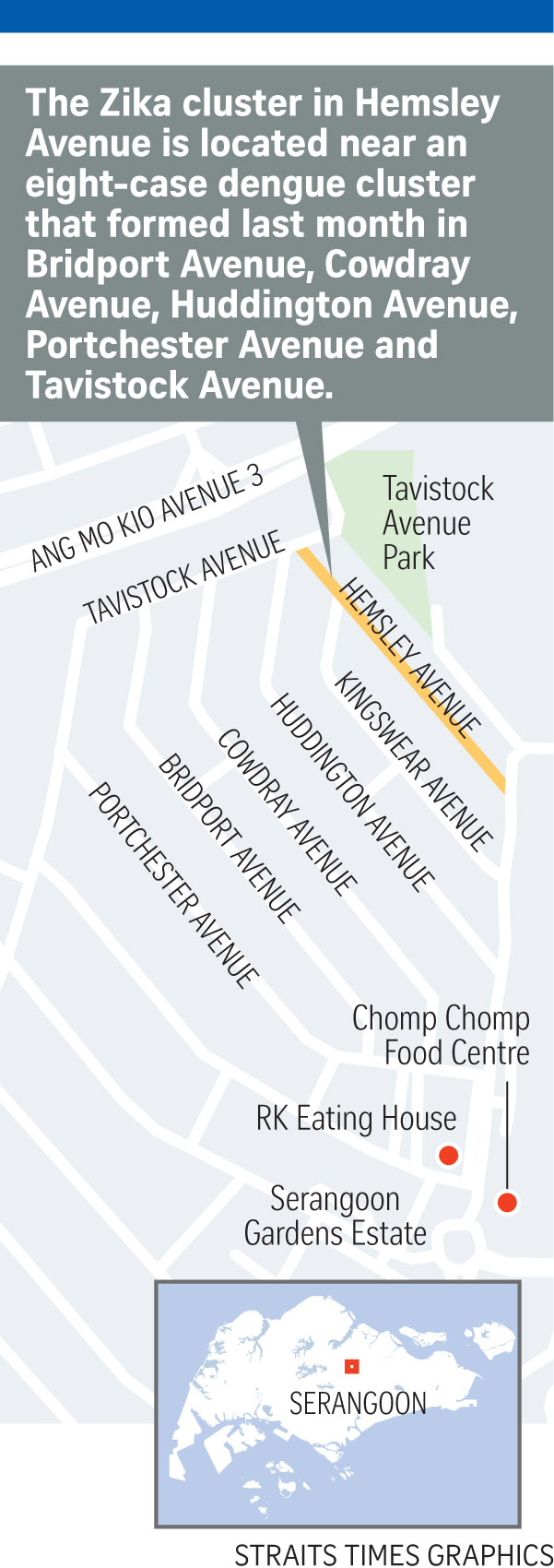 The NEA noted that the Zika cluster is near a dengue cluster of eight cases that formed last month in Bridport Avenue, Cowdray Avenue, Huddington Avenue, Portchester Avenue and Tavistock Avenue.