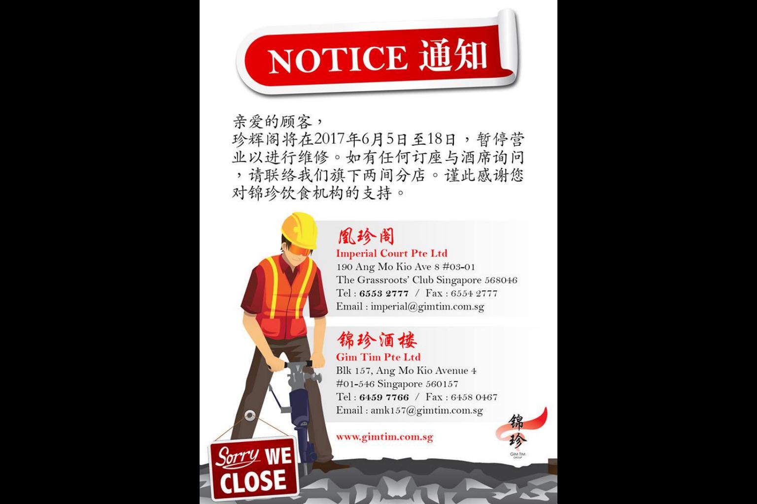 On its Facebook page, Tim Palace restaurant said it was closing for renovation from June 5 to June 18 and directed customers to its other outlets at Imperial Court or Gim Tim, both in Ang Mo Kio.