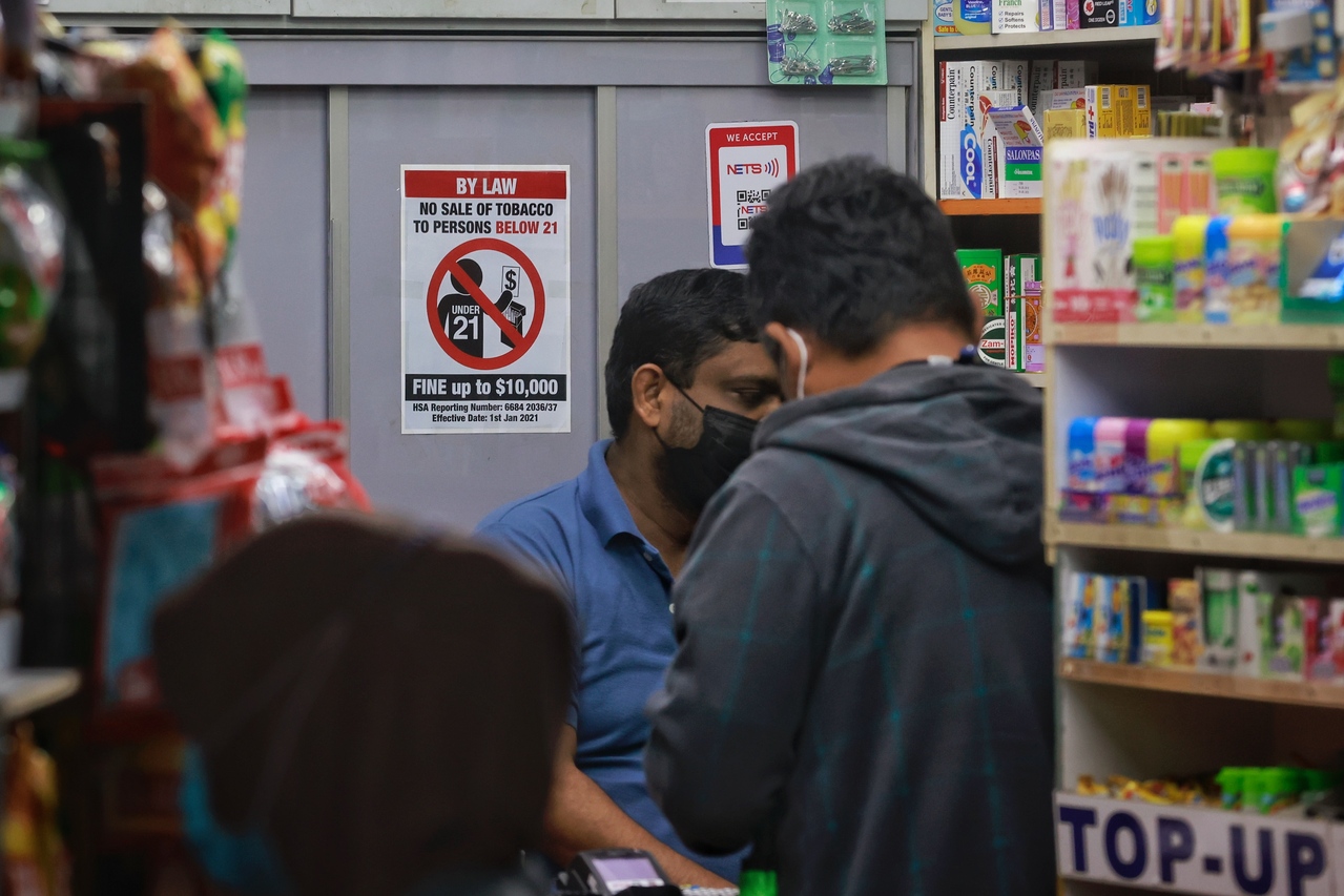 A sign in a convenience store at Bedok Interchange Food Centre showing the updated minimum age of 21 for people buying tobacco products.