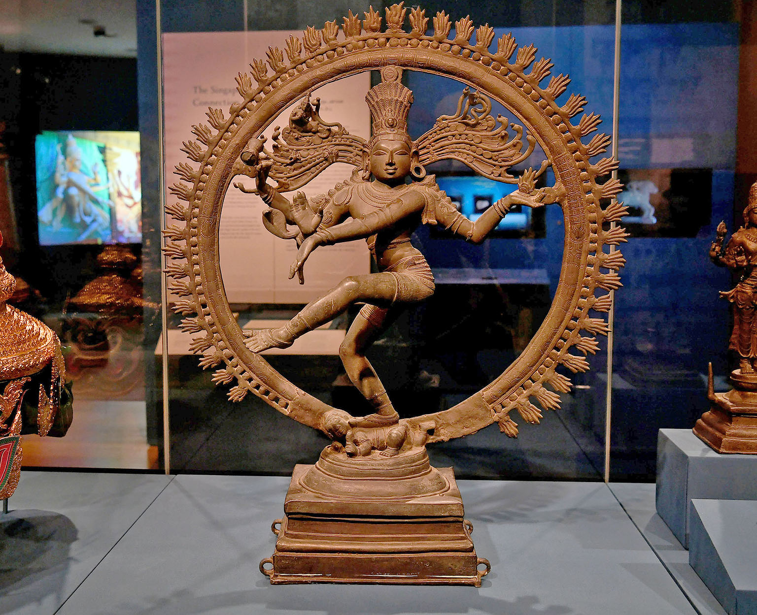 Walking into the exhibition, one of the first objects that greets visitors may be familiar yet still striking - the image of Nataraja, the iconic dancing form of the Hindu deity Siva. Nataraja combines the god's roles as creator, preserver and destroyer of the universe and symbolises the Indian concept of time's never-ending cycle. The four-armed bronze figure holds a hand drum and fire, and assumes the gesture of abhaya, or protection. His hair flies to the sides from the energy of his cosmic dance (ananda tandava). Each Nataraja bronze is unique as the creation processes require the mould to be broken. This one comes on loan from the National Museum in New Delhi. Appearing as early as the 5th century, production picked up during the Chola period as the figures were used for worship and as emblems of the Chola rulers. The art remains a living tradition.
