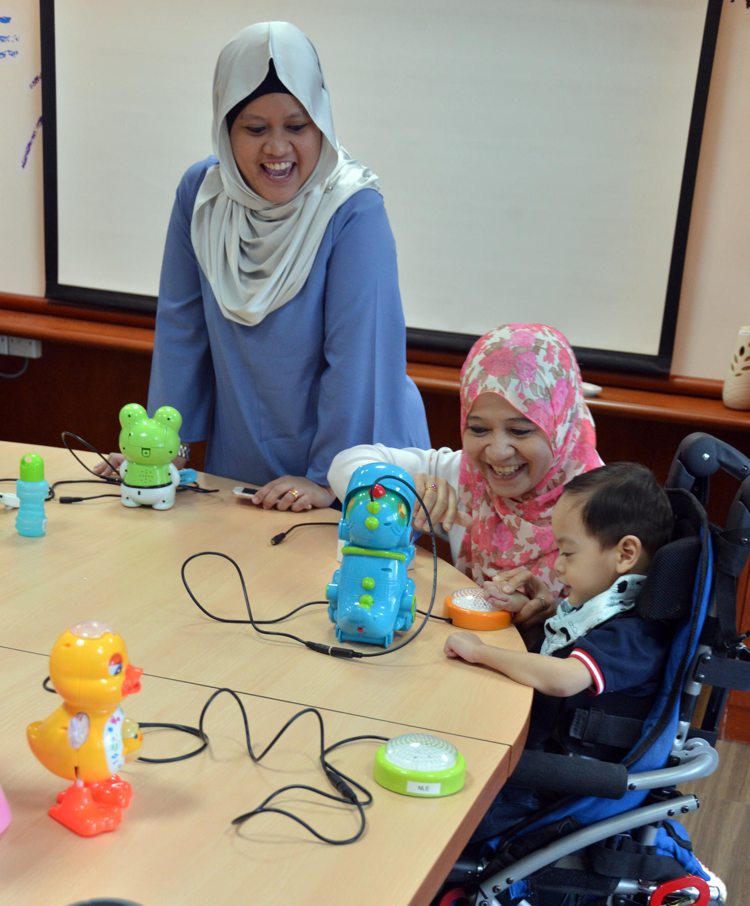 Ms Nur Hidayah Shahrudin (left, in blue) watches as her three-year-old son, Rizq Nawfal Hambril, play with a toy modified by DSO National Laboratories engineers at SPD. Rizq has cerebral palsy, which makes it difficult for him to play independently with normal toys.