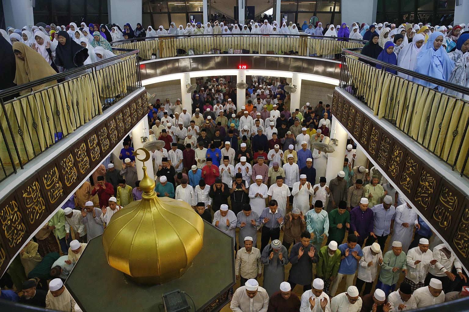 Muslim congregants performing evening prayers, also know as 'Tarawih', to mark the eve of the first day of Ramadan at Al-Mukminin Mosque in Jurong East Street 21 on June 17, 2015.