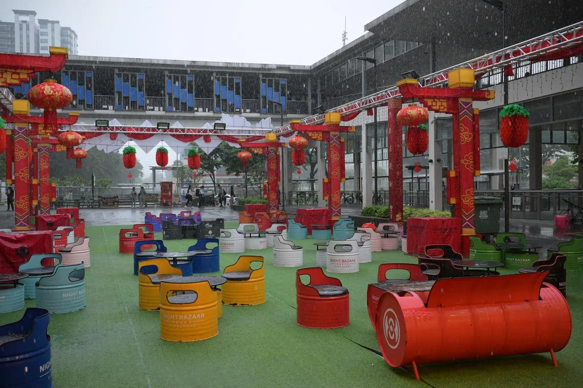 Bukit Panjang Night Bazaar at Hillion Mall saw little traffic due to the rainy weather. A monsoon surge between Jan 10 and 13 caused prolonged rainy weather.