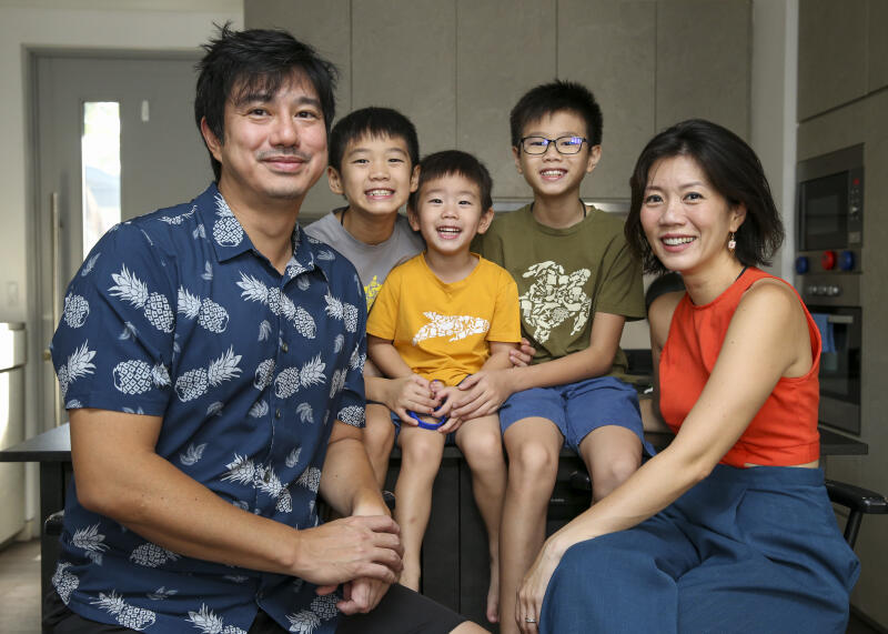 Mr Tseng Wun Hsiung, and his wife, Mrs Cherie Tseng, with their children at home in Singapore, on Feb 7, 2021.