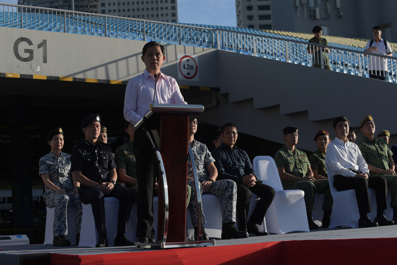 Minister for Trade and Industry Chan Chun Sing speaking at a Total Defence Day event at The Float @ Marina Bay on Feb 15, 2020.