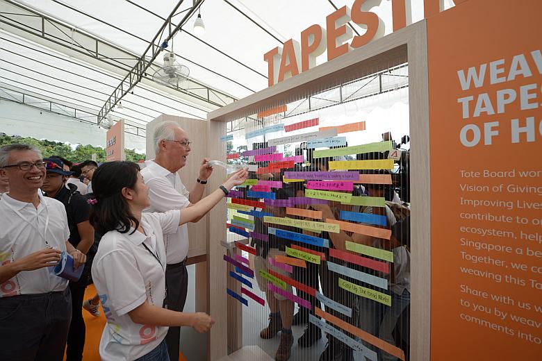 ESM Goh Chok Tong inserts a piece of tapestry with his message "Give Hope Spread Happiness" at the Tote Board Singapore's celebration of 30 years of giving at a Gardens by the Bay event, A Good Day Out, on Feb 10, 2018 .
