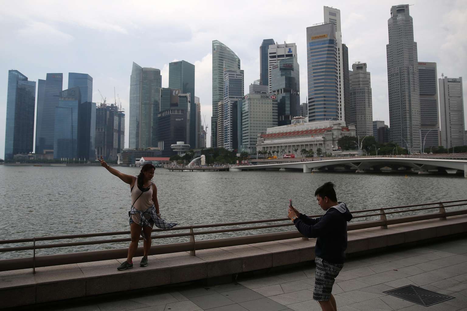 Tourists taking photos of themselves against the Singapore skyline on Jan 20, 2016.
