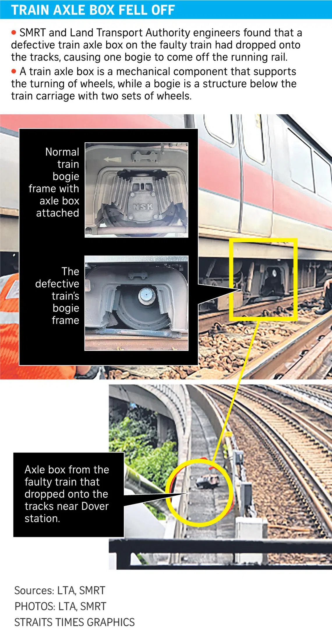 A defective component of the train’s wheel set, known as an axle box, dropped onto the tracks near Dover station while the train was returning to Ulu Pandan Depot, which is between Clementi and Jurong East stations.