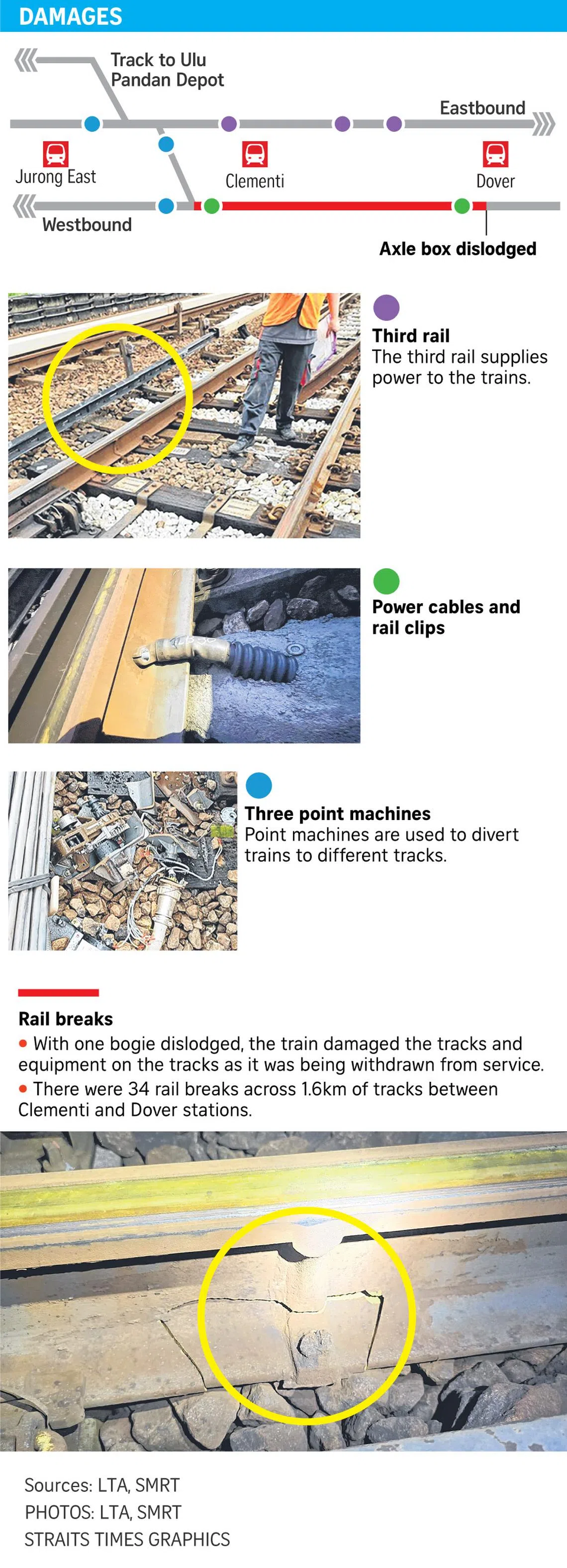 Engineers later found 34 rail breaks, such as cracks or chips, along 1.6km of tracks between Clementi and Dover stations after overnight checks. The train also damaged three point machines that are used to divert trains to different tracks, stretches of the third rail on the eastbound track that supplies power to trains, as well as power cables and rail fasteners.