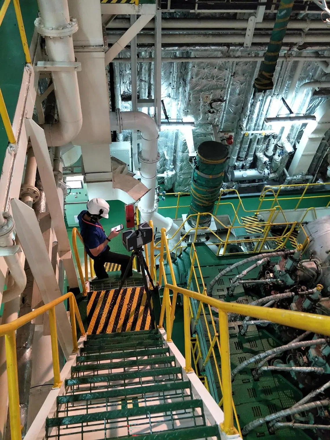 A marine safety investigator is recording how the scene looks like in the engine room on board a ship with a 3D scanning device.