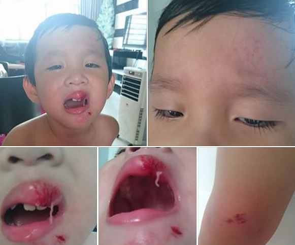 The boy had to be taken by ambulance to KK Women's and Children's Hospital for treatment of his injuries, which included bruises, loose teeth and a cut on his chin that required stitches, said housewife Kaslyn Tan, 25.