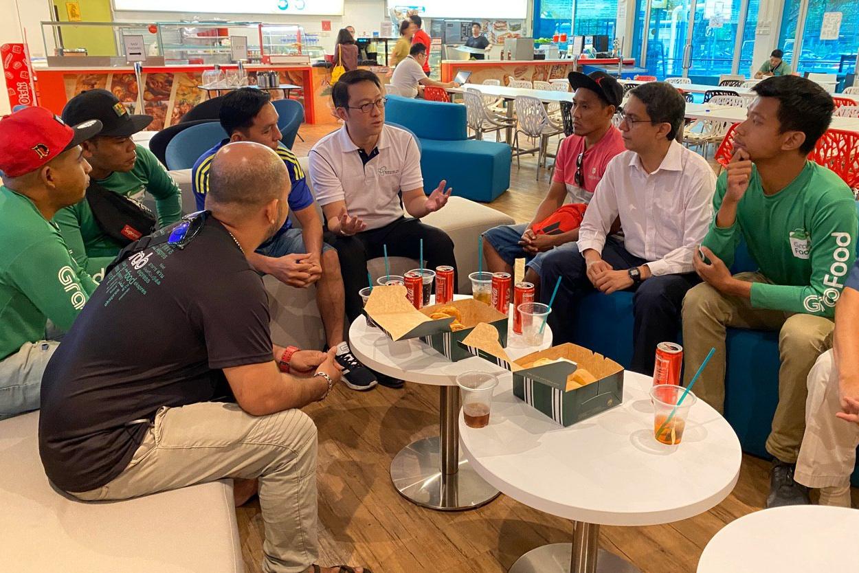 Senior Minister of State for Transport Lam Pin Min (in white, left) and Senior Parliamentary Secretary for Social and Family Development and Education Faishal Ibrahim (in white, right) speaking to delivery riders at LTA's headquarters along Hampshire Road on Nov 8, 2019.