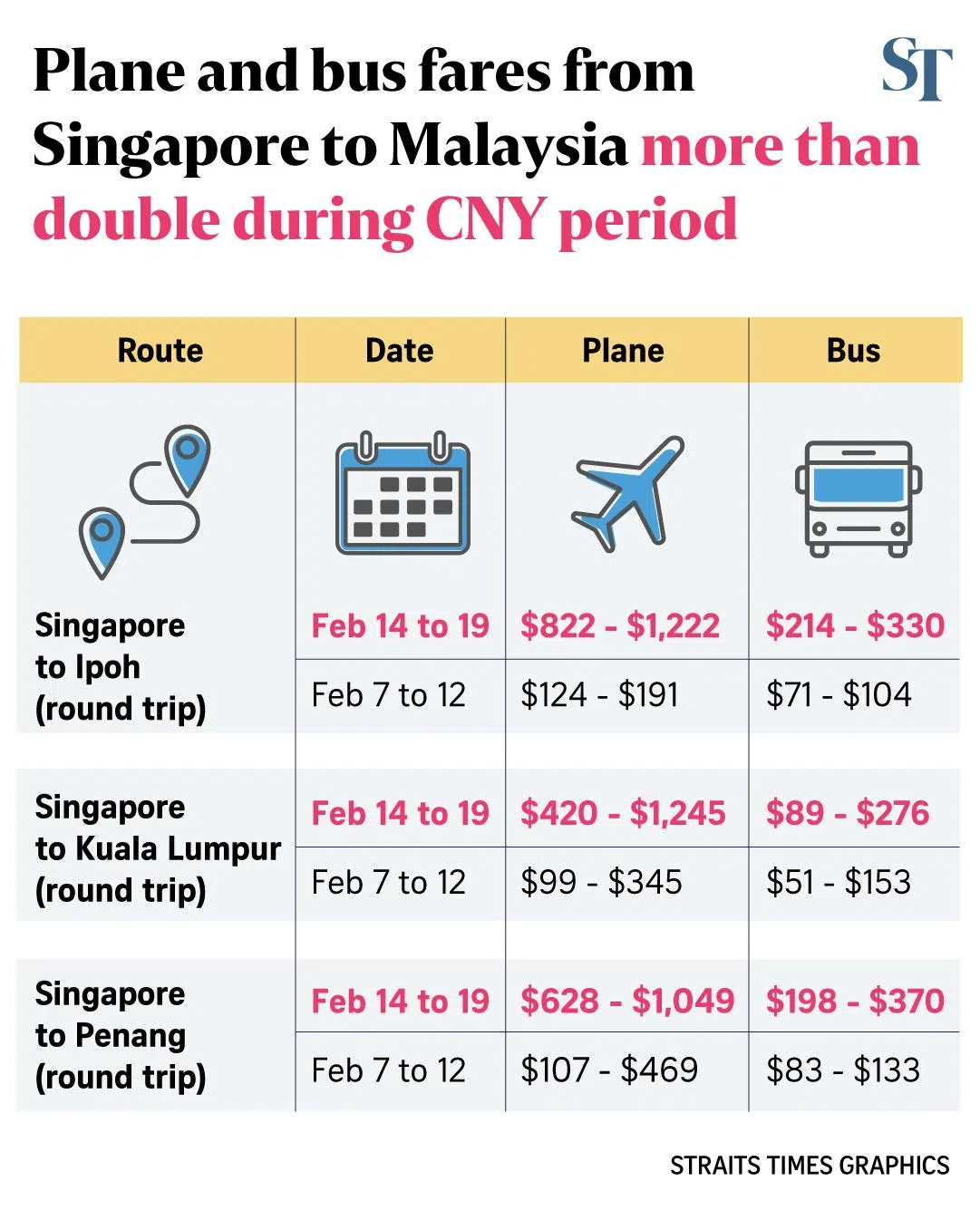A two-way trip from Singapore to Kuala Lumpur by air would range from $420 to $1,245 in the days leading up to Chinese New Year, compared with a fare between $99 and $345 from Feb 7 to 12.