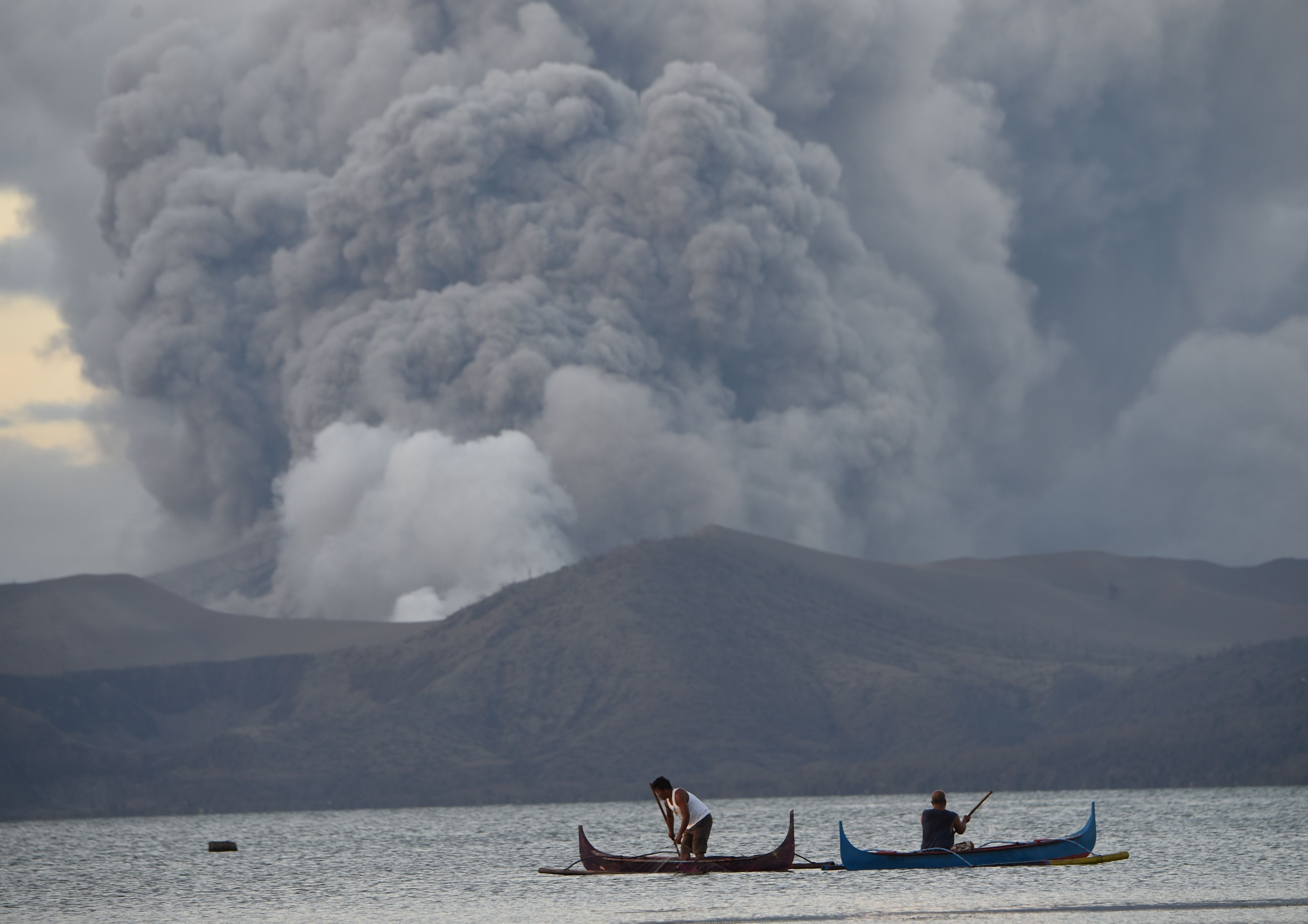 Residents living along Taal lake catch fish as the volcano erupts in Tanauan town, Batangas province south of Manila, on Jan 14, 2020.