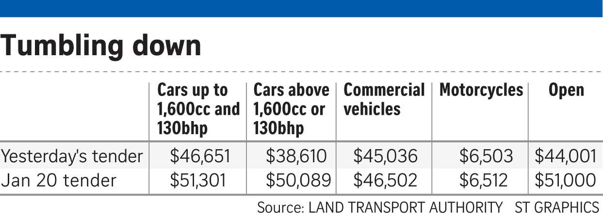 The open COE, which can be used for any vehicle type but ends up mostly for bigger cars, dropped by 13.7 per cent to finish at $44,001, its lowest in more than five years.