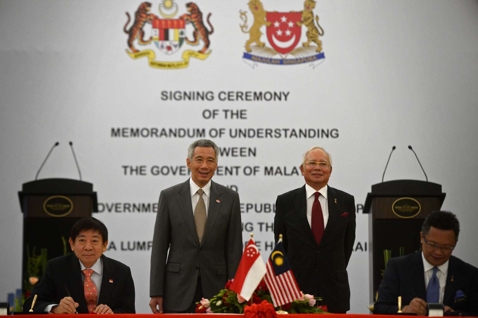 Singapore's Minister for Transport Khaw Boon Wan and Malaysia's Minister in the Prime Minister's Department Abdul Rahman Dahlan sign the High Speed Rail MOU at the Prime Minister's official residence on July 19, 2016.