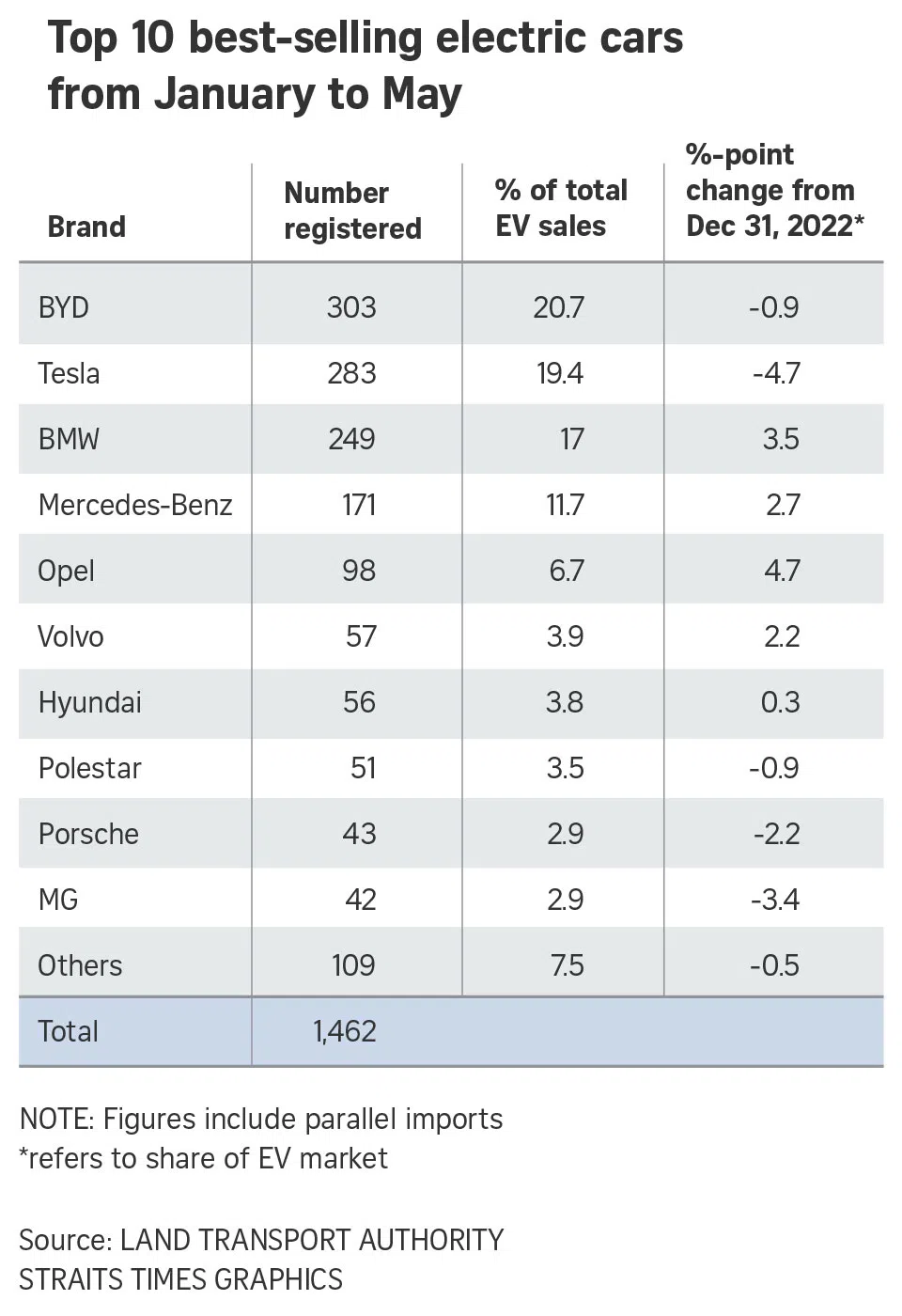 SINGAPORE - The year is going well for Chinese electric carmaker BYD, which zoomed past the United States’ Tesla in the first five months of 2023 to become Singapore’s best-selling battery-powered brand.