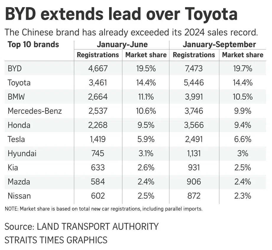 SINGAPORE – BYD, the top-selling car brand in Singapore, registered 7,473 cars here in the first nine months of 2025, extending its lead over Toyota.