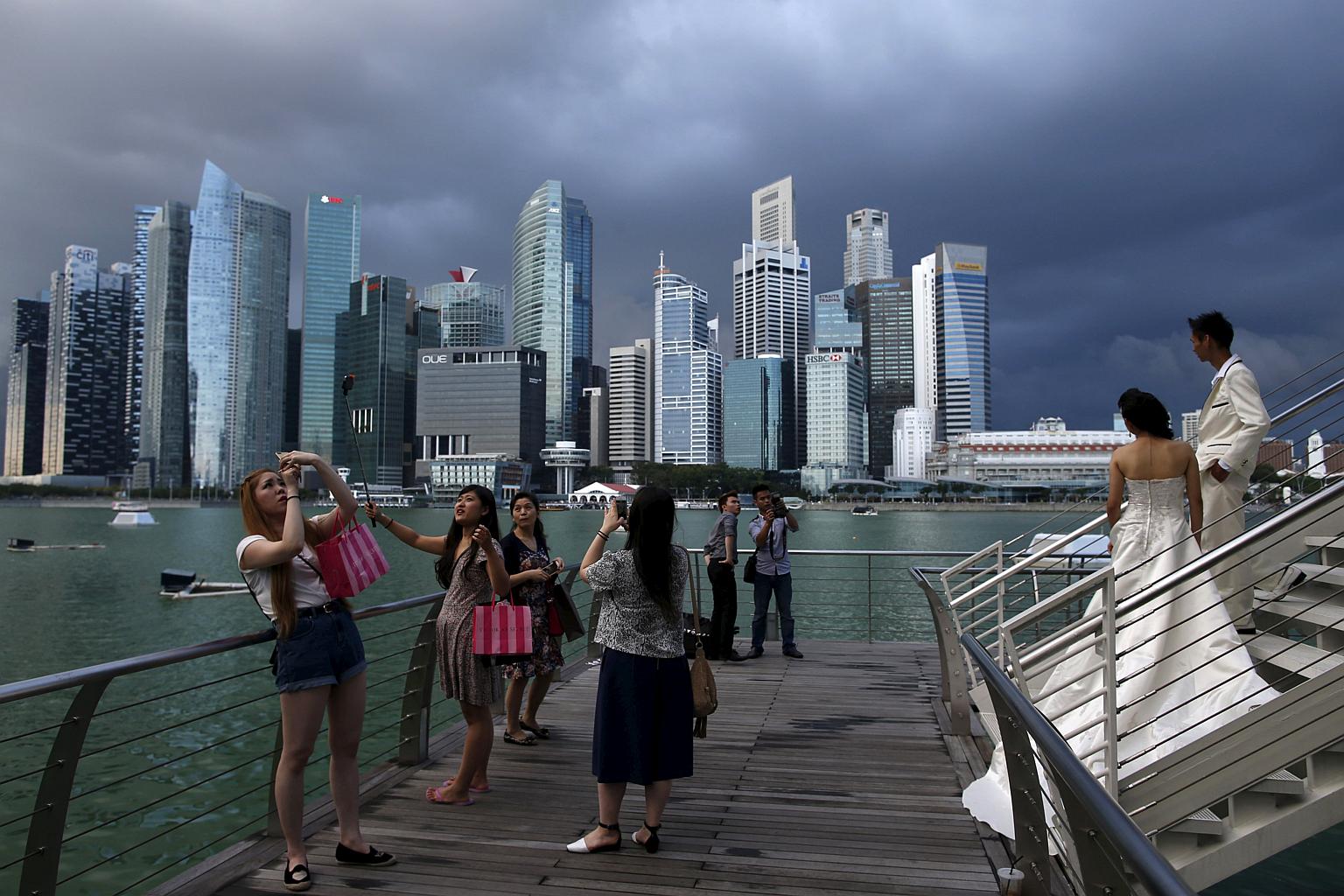 Tourists and a couple take photos along Marina Bay, Mar 9, 2015.
