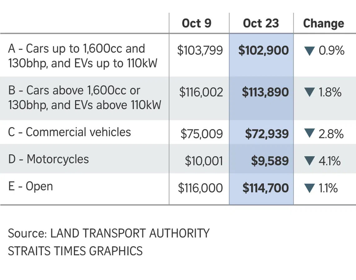The premium for a Category A certificate, which is used to register smaller, less powerful cars and electric vehicles (EVs), ended at $102,900 – 0.9 per cent lower than the $103,799 recorded at the previous exercise on Oct 9